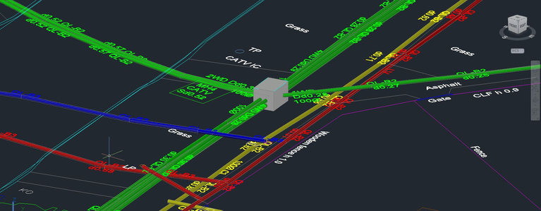 A 3D view of a utility survey where the traced pipes were „dressed” and modeled with their true size and depths.