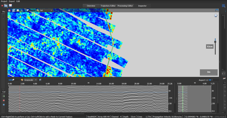 GPR data processing where the datasets collected by our client using Leica Stream Up vehicle-mounted GPR and Leica Stream-C GPR. The data has been interpreted in IQMaps and processed in AutoCAD.